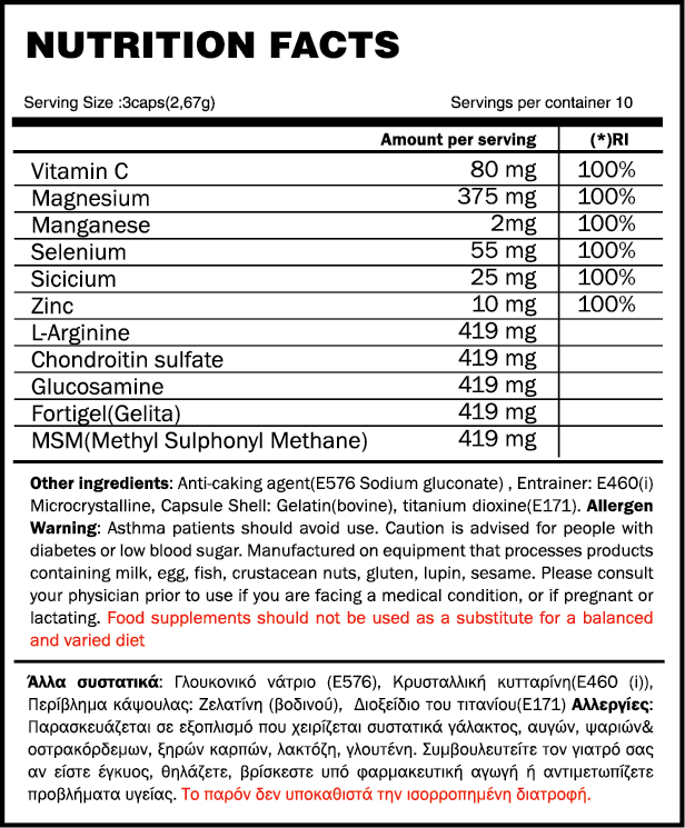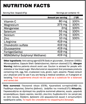 Περιέχει όλους τους γνωστούς συμμάχους των που βελτιώνουν την υγεία των αρθρώσεων MSM, glucosamine, chondroitin καθώς και FORTIGEL®. Είναι ιδανικό για τις αρθρώσεις των αθλητών που επιβαρύνονται καθημερινά από την προπόνηση, τις χρόνιες φλεγμονώδεις καταστάσεις ή ακόμα και από την λανθασμένη στάση σώματος στη δουλειά ή τον ύπνο. Επίσης, είναι ιδανικό για τις μεγαλύτερες ηλικίες που αντιμετωπίζουν προβλήματα φθοράς και αλλοίωσης των αρθρώσεων και των χόνδρων.