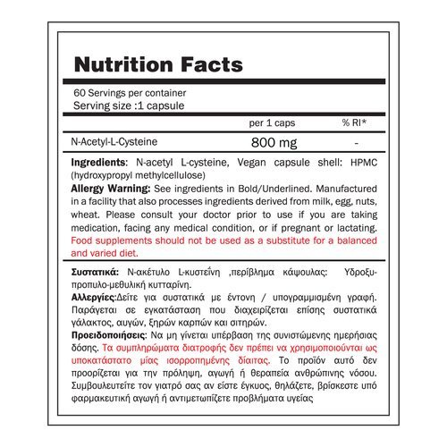 Η NAC (N-Ακέτυλο-Κυστεΐνη) είναι ένα θειούχο αμινοξύ, το οποίο είναι δομικό στοιχείο για το σχηματισμό πολλών πρωτεϊνών, ενώ έχει σημαντικό ρόλο και στην ηπατική σύνθεση του πεπτιδίου της γλουταθειόνης. Η Γλουταθειόνη είναι ένα πολύ ισχυρό, σουπερ- αντιοξειδωτικό, το οποίο καταπολεμά τις ελεύθερες ρίζες σε όλο το σώμα.