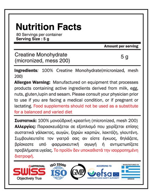 Δοσολογία: Καταναλώστε 5 γρ(1 κουταλάκι του γλυκού). καθημερινά. Κατά προτίμηση καταναλώστε πριν ή/και μετά την προπόνηση, μαζί με χυμό ή άλλο υδατάνθρακα, καθώς τα σάκχαρα των υδατανθράκων αυξάνουν την απορρόφηση της κρεατίνης.